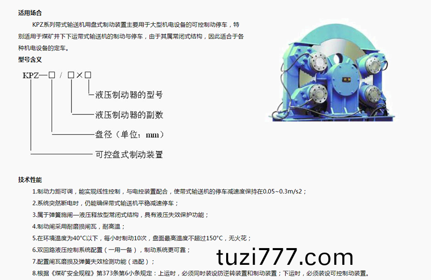 KPZ係列製動器主要用于下運帶式輸送機或大傾角上運式輸送機等大型機電設備的可控製動與停車,