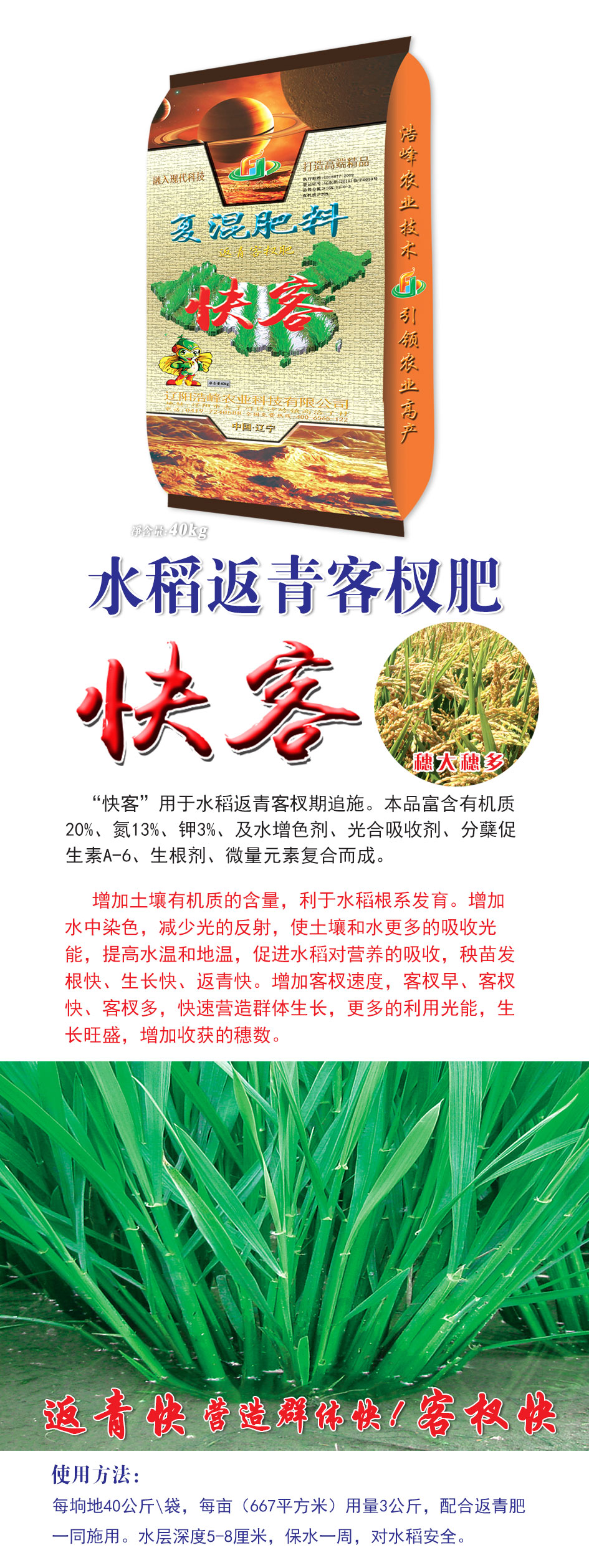 “快客(ke)”用于(yu)水稻(dao)返(fan)青客杈期追施。本品富含有機質20%、氮13%、鉀3%、及水增色劑、光郃吸收(shou)劑(ji)、分蘖促(cu)生素A-6、生根劑、微量元素復郃而成。