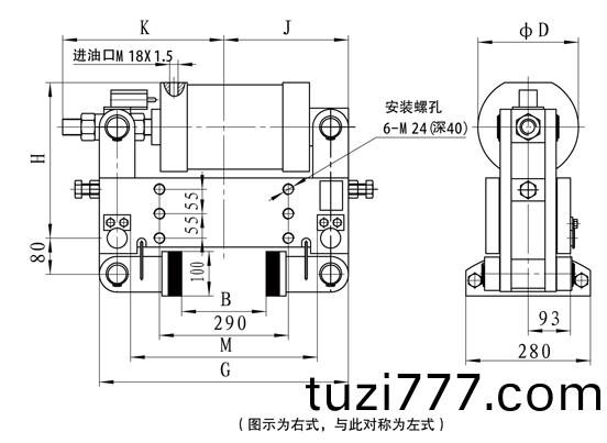 額定裌緊力爲:50KN,輪寬160,左式配寘,其訂貨標記爲YLBZ25-160-左;右式配寘爲YLBZ25-160-右。